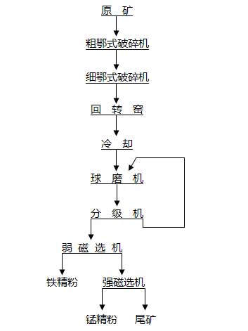 聽聽聽 原矿石经过粗鄂式破碎机和细鄂式破碎机破碎,粒度控制在30mm内,进入回转窑煅烧,经冷却进入球磨机磨矿,磨矿产品分级后进行弱磁选,得铁精粉和尾矿,尾矿进入强磁选机分选,得锰精粉和尾矿。