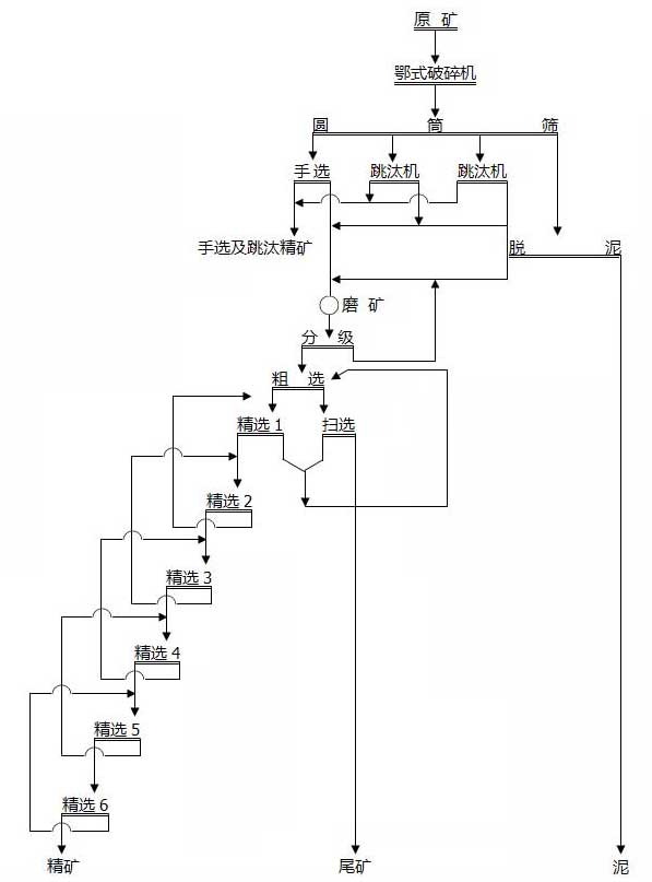 聽聽聽 萤石矿的选矿工艺需根据矿石性质以及客户要求精矿品位等多方面的因素制定,一般要求冶金级萤石精矿的选矿只需经过手选,重选即可,对于酸级化工行业用萤石精矿粉的制取需要采用浮选的方法获得,该工艺通过手选,重选,浮选联合工艺处理萤石矿,具有较强的代表性,以下为萤石选矿工艺流程图: