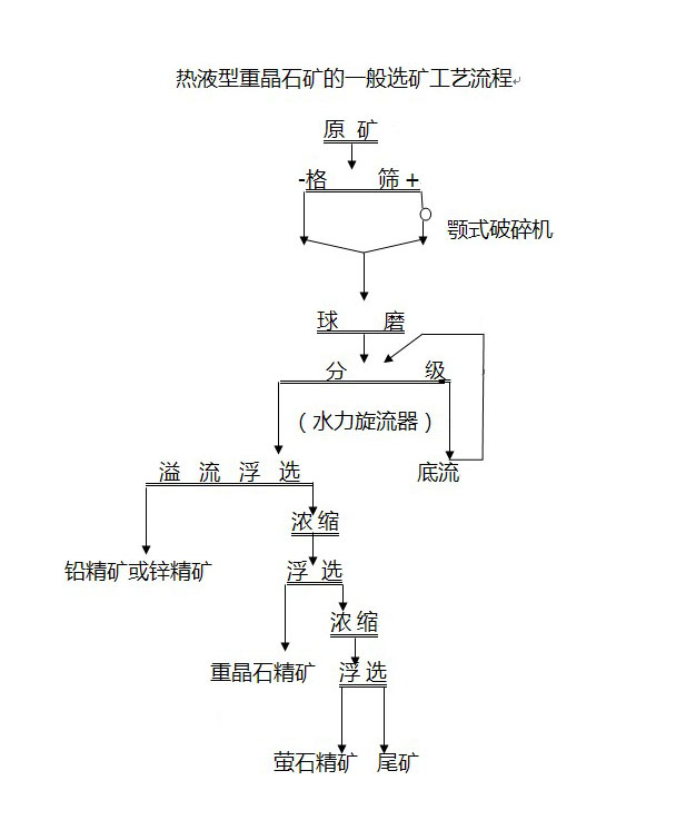 重晶石矿选矿时根据重晶石与伴生矿物的表面物理化学性质的差异,可以采用浮选法选矿,该选矿工艺常用于重晶石与硫化矿、萤石等伴生的热液型重晶石矿石。
