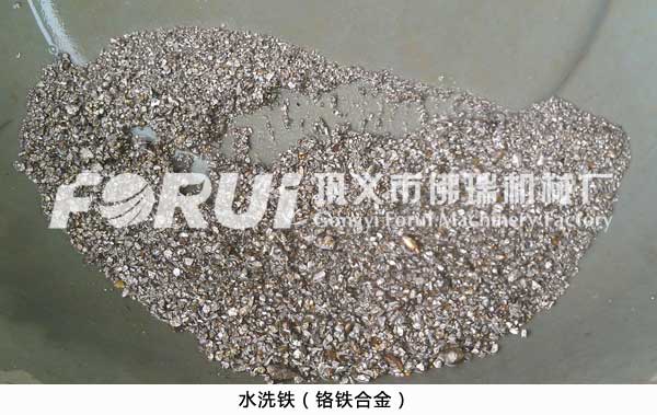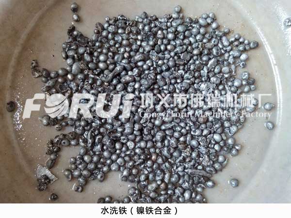 水洗铁顾名思义就是用水冲洗的方法回收起来的铁合金,包括铬铁合金,镍铁合金,硅锰合金等等,这些合金都是从冶炼渣中洗选出来的,所用的设备也同样都是跳汰机。为什么要用跳汰机来洗选这些铁合金呢?因为这些铁合金都没有磁性,采用常规的方法难以回收,但是他们有较大的密度,与废渣之间存在较大的差异,采用这一差异就能用重选的方法加以回收,跳汰机就是这么一种根据物料间的比重差来分选的设备。下图是我们用跳汰机洗选出来的水洗铁照片: