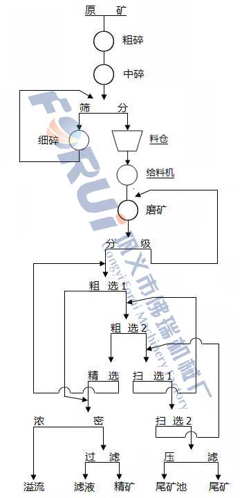 原矿石经过粗碎和中碎后进入筛分流程,筛分出粒度较大的块矿进行细碎,粒度达到30mm以内的矿石进入料仓,料仓下设置给料机,将物料均匀给如球磨机进行磨矿,球磨机的磨矿产品经过分级,达到入选粒度的物料进入浮选流程,为达到粒度要求的返回磨矿流程继续磨矿,浮选流程设置为一次两次粗选,一次精选,两次扫选,此工艺适用于可浮性较高的矿物,如硫铁矿。经过浮选后的精矿和尾矿分别进行浓密,压滤等过程最终得到精矿和尾矿以及溢流。