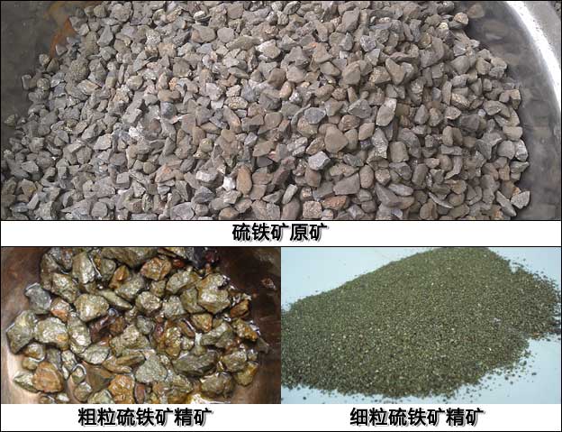 我们首先来看一组硫铁矿的照片,下图中的上方为硫铁矿原矿破碎后的照片,右下图为细粒的硫精砂,左下图为粗粒的硫铁矿精矿,硫精砂和粗粒硫铁矿精矿都是通过跳汰机重选所得。