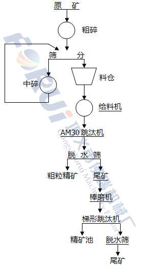 重力选矿适用于粗,中,细粒级的物料选矿,对微细粒物料的分选效率不高,目前的重力选矿已经被应用至铁矿石,锰矿石,硫铁矿,钨锡矿,汞矿,砂金矿,砂锡矿,钽铌矿,重晶石,萤石,天青石,石榴石等矿石的选矿和提纯,被扩展应用至硅锰渣,镍铁渣,铬铁渣以及铜冶炼渣等工业冶炼废渣的回收和处理,下面是佛瑞机械设计的一个重选工艺流程图(此工艺为一般工艺流程,不针对任何矿物,仅作为参考):