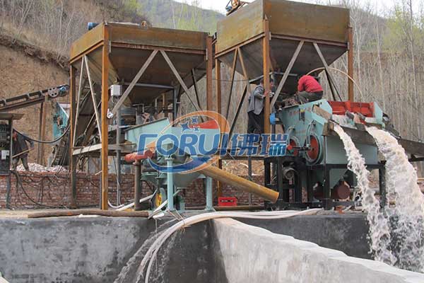 该重晶石选矿生产线由鄂式破碎机,圆筒洗矿机,圆振动筛,料仓,给料机,大颗粒跳汰机,脱水筛等设备组成,重晶石首先通过鄂式破碎机粗碎,粗碎后的物料通过皮带输送机给入圆筒洗矿机洗矿,洗矿后的物料进入圆振动筛筛分为不同的粒级,分别进入料仓,经过震动给料机将物料均匀给入跳汰机进行重力选矿提纯,跳汰机的精矿和尾矿进入直线脱水筛脱水处理,然后分别运输至目的场地。下面是我们为贵州客户设计建造的时产60吨重晶石矿选矿生产线工作现场视频: