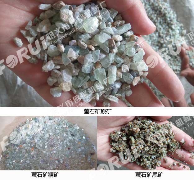 聽 聽 从照片中我们可以看出,原矿石的品位已经较高,但其中混杂着一些萤石和脉石的连生体,另外还有一些废石,导致萤石矿的品位下降,要想把萤石矿的品位提高到95%以上,就必须抛弃矿石中的废石和连生体,在经过精心的准备和调试后,佛瑞机械开始进行萤石选矿试验,并得到上图中的精矿和尾矿,选矿试验的效果得到客户的认可,此次大胆的尝试,充分证明了佛瑞机械对萤石选矿的信心和技术,同时也证明了用跳汰机生产高品位的萤石精矿也是完全有可能的。